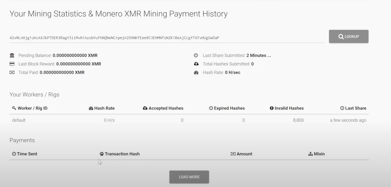Pour ce faire, accédez au site web du pool choisi et collez l’adresse de votre portefeuille Monero pour voir l’historique des paiements.