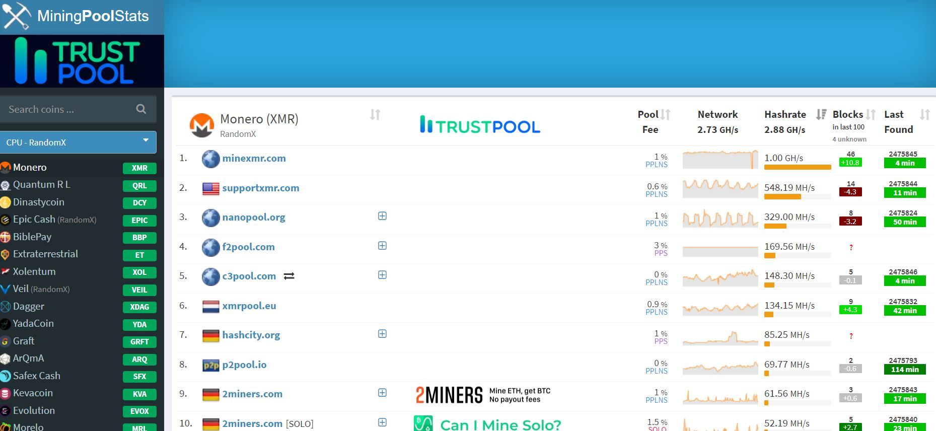 Certes, les pools de minage sont le moyen le plus simple de miner Monero. Cependant, ils facturent des frais de service (0 à 2%), et répartissent les récompenses sur tous les mineurs du pool. Parmi les pools de minage Monero les plus populaires, nous pouvons citer : MoneroOcean, XMRPool et 2miners. Vous pouvez suivre les pools de minage en temps réel sur miningpoolstats.stream ou pools.xmr.wiki.