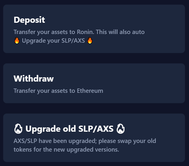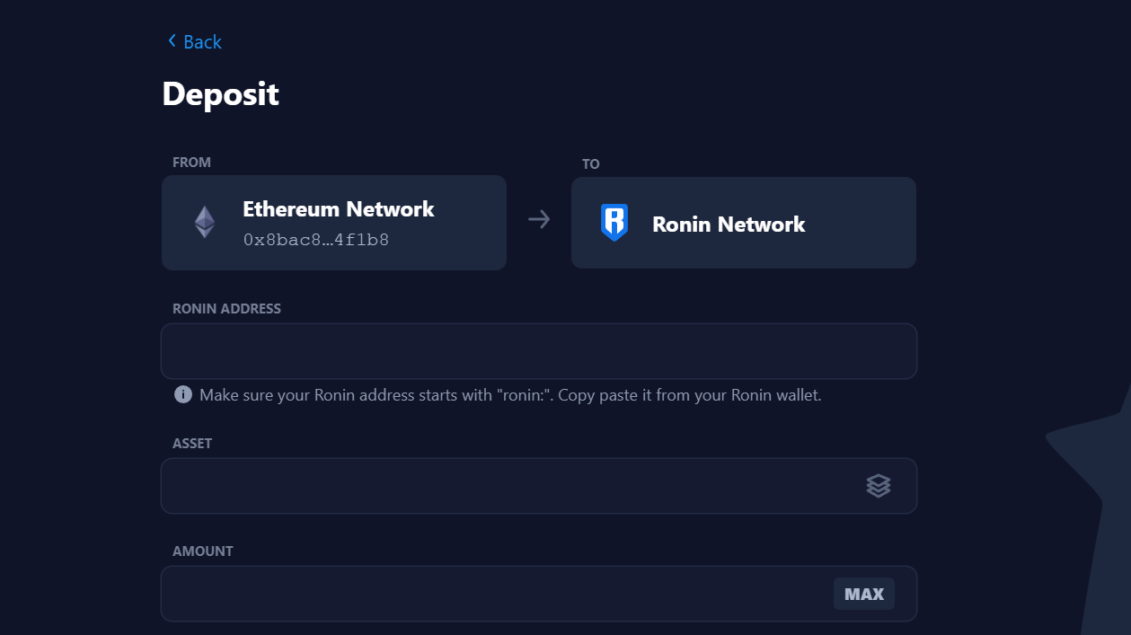 Maintenant que vos jetons sont dans votre portefeuille Metamask, vous devez à présent les transférer sur votre portefeuille Ronin. Pour cela, vous devrez être redirigés vers Ronin Bridge. Cliquez sur “Deposit”.