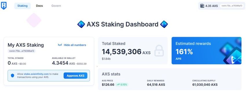 Dans ce cas précis, AXS, ou Axie Infinity Shards, représente le jeton de gouvernance de l’univers Axie. Ses détenteurs peuvent réclamer des récompenses en le plaçant en staking, en jouant au jeu et en participant à certains votes de gouvernance. Nous avons précédemment expliqué dans un dernier guide comment jouer à Axie Infinity ; à présent, nous allons nous intéresser à la manière de staker l’AXS sur sa plateforme.
