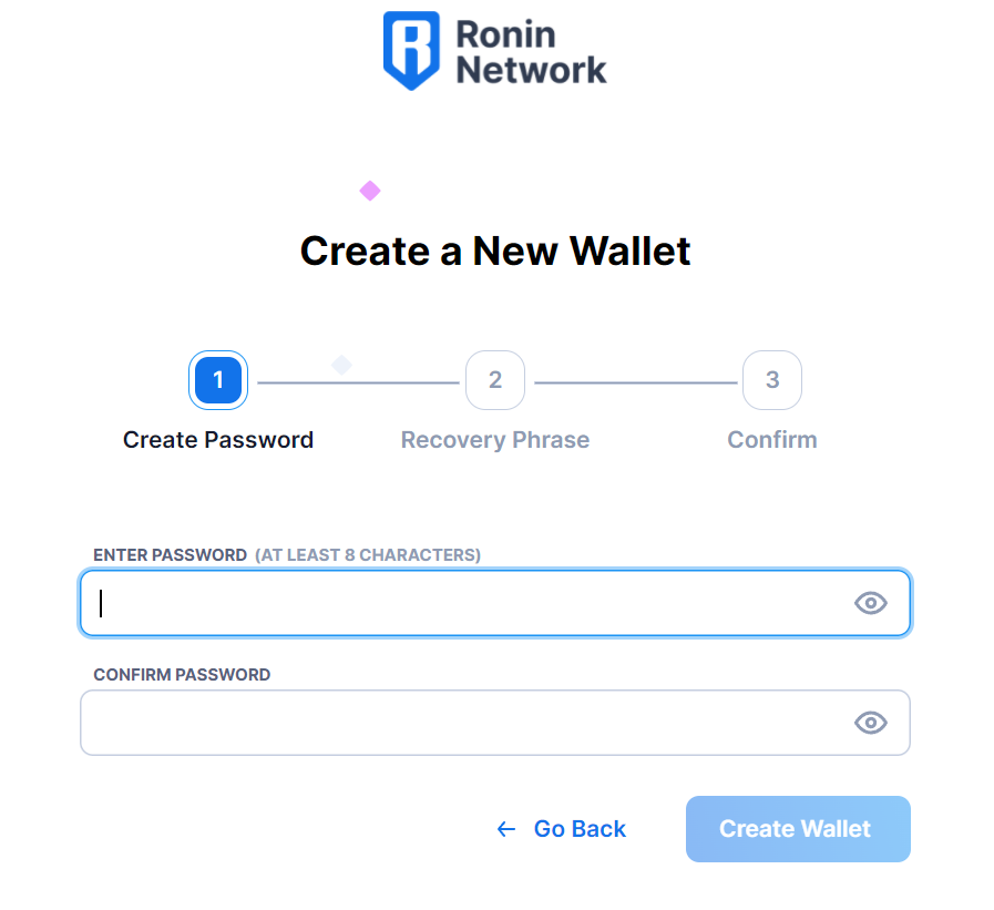 Vous serez ensuite redirigés vers l’étape de création de votre portefeuille. Tapez un mot de passe de votre choix d’au minimum 8 caractères.