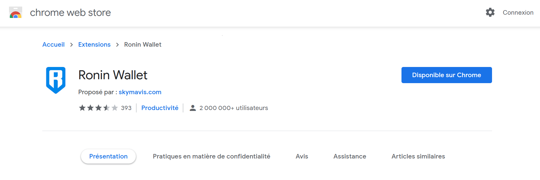 Ronin est un portefeuille Ethereum spécialisé pour les jeux blockchains. Pour télécharger Ronin, rendez vous sur Firefox ou Google Chrome et son App Store et téléchargez l’application.