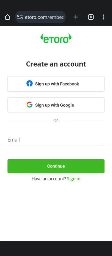 3. Vous pouvez vous inscrire sur eToro en utilisant une adresse e-mail ou un compte tiers (par exemple Google ou Facebook).