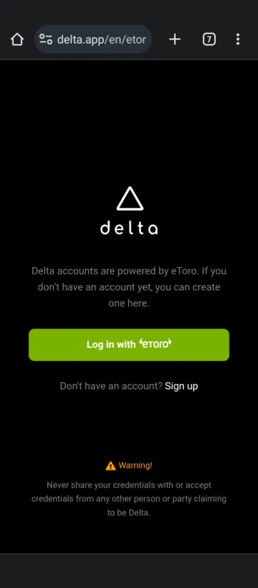 2. Vous serez ensuite redirigé(e) vers le site web de Delta tracker. Pour vous connecter, vous aurez besoin d’un compte eToro.