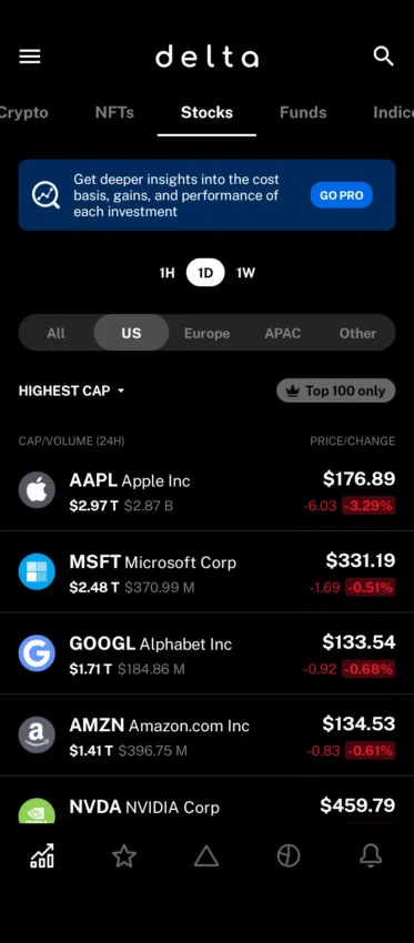 Avec Delta Pro, vous pouvez accéder à plusieurs fonctionnalités exclusives moyennant un paiement de 58,99 $ par an. Cette version premium vous permet non seulement de rester à l’affût des derniers mouvements du marché, mais également de consulter les données historiques. De plus, elle propose une section qui vous aide à comprendre les raisons derrière les mouvements du marché.