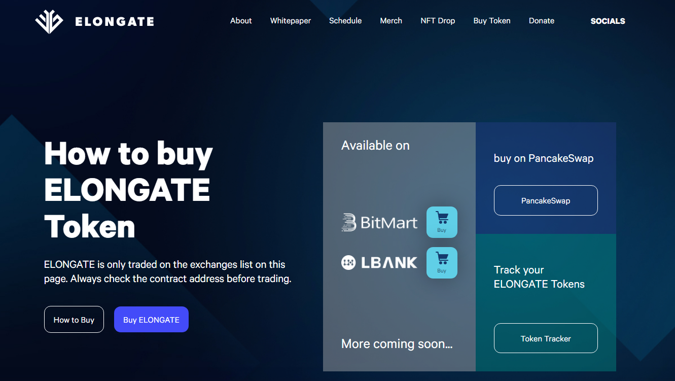 ElonGate a une section sur son site web intitulée “Buy token”, qui liste les plateformes où il peut être acheté. Cela dit, il n’est toujours pas répertorié sur les principaux exchanges comme Binance et Coinbase.