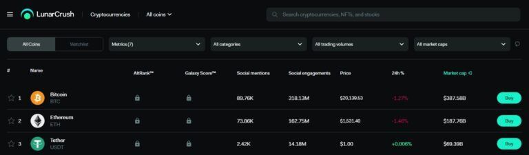 Voici la plateforme Lunar Crush qui vous permet de calculer les mentions et les hashtags de mots clés crypto sur les réseaux sociaux.