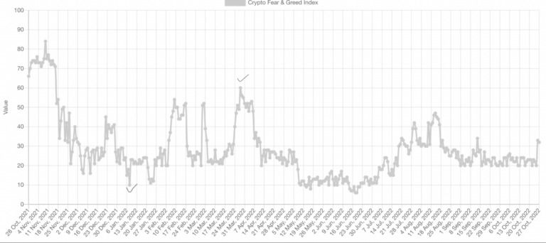 Évolution de l’indice de peur et d’avidité de la crypto (du 28 octobre 2021 au 27 octobre 2022) :