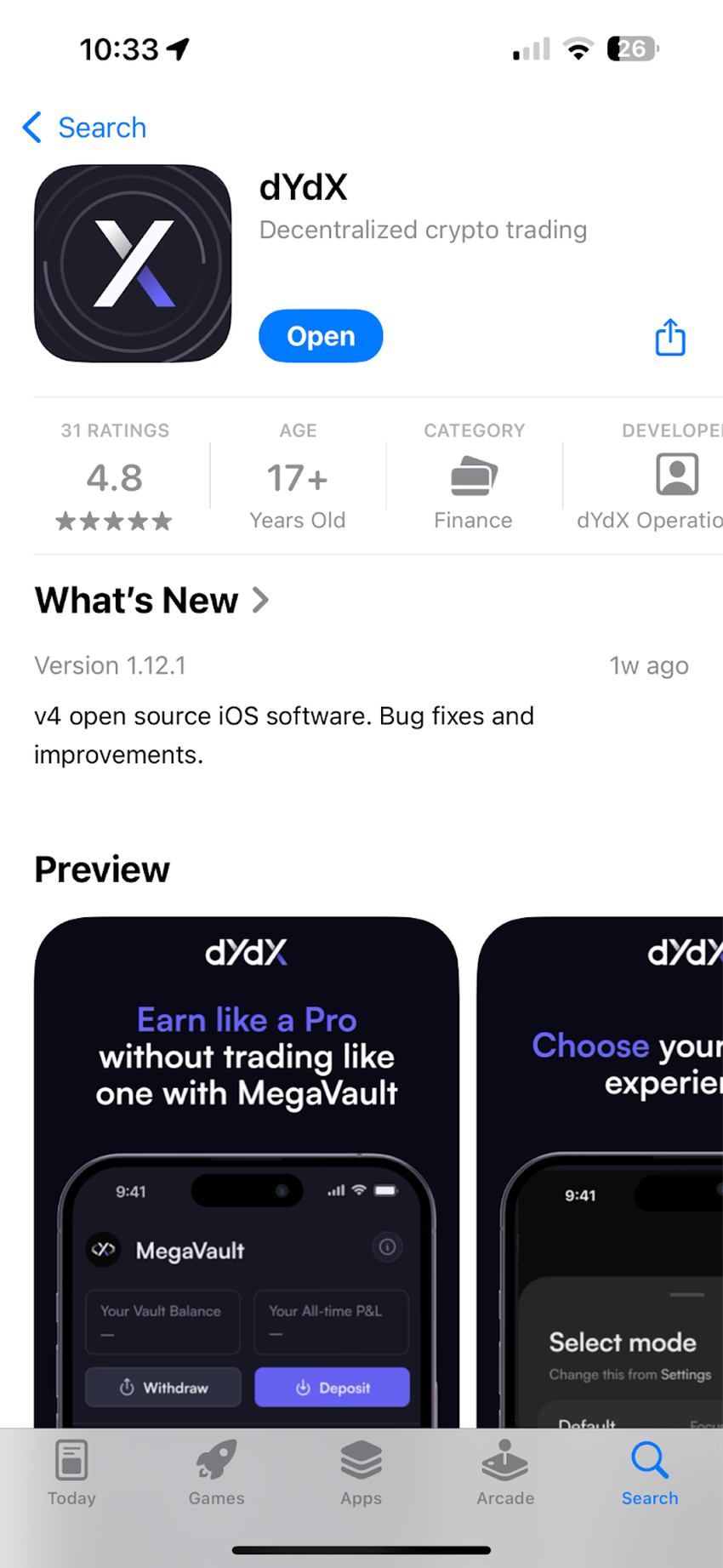 ➤ dYdX a mis à jour son application iOS en février 2025. L’application actualisée offre une meilleure accessibilité et gestion des risques, ainsi qu’une vitesse d’exécution des transactions accrue.