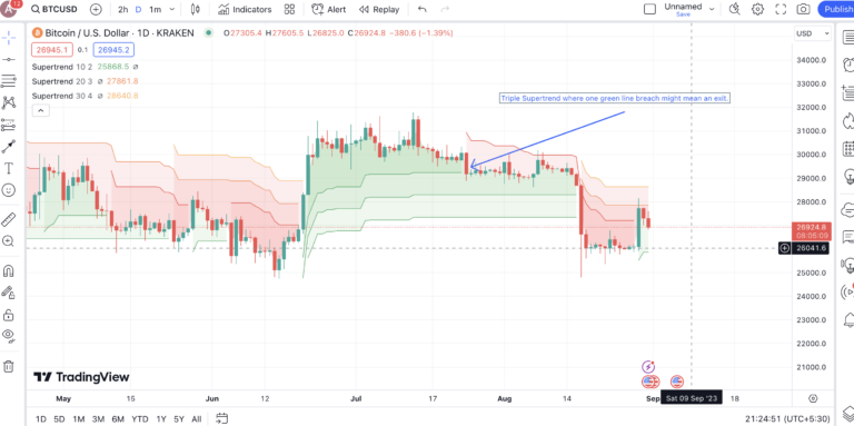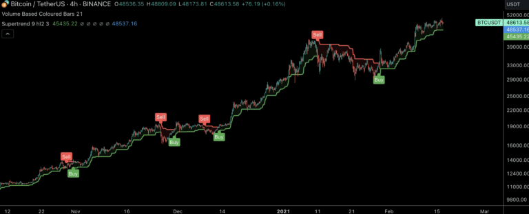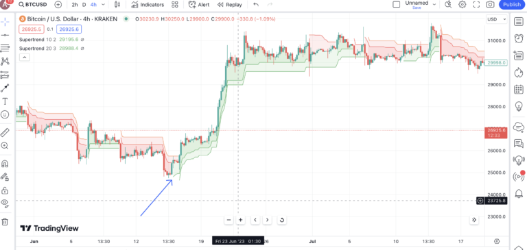 Cette stratégie, qui nécessite l’utilisation de plusieurs périodes, est particulièrement utile pour les investisseurs qui cherchent à minimiser les risques. Pour l’utiliser, vous devrez travailler séparément avec plusieurs graphiques sur plusieurs périodes. Vous pouvez utiliser le même paramètre SuperTrend pour chaque période et voir s’il existe un alignement. Par exemple, si vous envisagez de trader Bitcoin, vous pouvez utiliser des graphiques quotidiens et des graphiques sur 4 heures pour confirmer les tendances haussières.