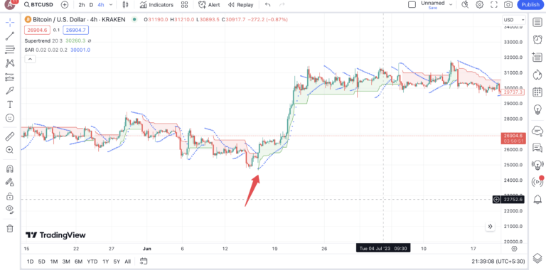 Le Parabolic SAR, ou Stop And Reverse parabolique, est un indicateur composé de plusieurs points qui permettent d’identifier les tendances haussières. Vous pouvez le combiner avec ligne verte du SuperTrend pour identifier les opportunités d’achat. Pour tirer parti de cette stratégie, il est préférable d’utiliser les deux indicateurs sur des graphiques de 30 minutes à 4 heures.