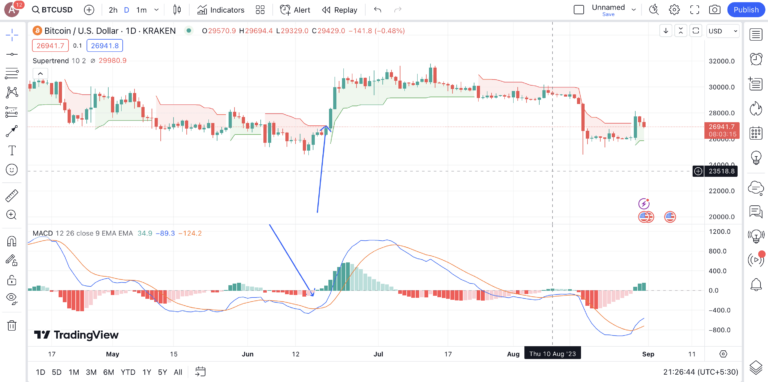 Saviez-vous que vous pouvez associer un autre indicateur de tendance à vos deux lignes SuperTrend ? Par exemple, vous pouvez vérifier si la ligne MACD passe au-dessus de la ligne de signal à chaque fois que la ligne SuperTrend devient verte. Cette stratégie fonctionne mieux sur des durées plus courtes (de 15 minutes à 4 heures). Cela dit, vous pouvez également utiliser des périodes plus longues.