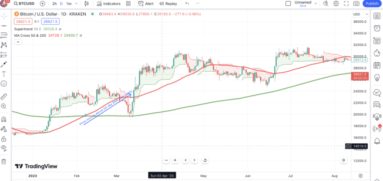 Pour une analyse plus approfondie, vous pouvez utiliser ce que l’on appelle la golden cross, c’est-à-dire le point où une EMA courte dépasse une EMA longue. Si l’indicateur SuperTrend passe au vert au moment du croisement, vous pouvez considérer cela comme un signal d’achat. L’inverse est vrai lorsque vous apercevez une death cross ou lorsque le prix tombe en dessous de la ligne EMA sur 50 périodes et que la ligne SuperTrend devient rouge.