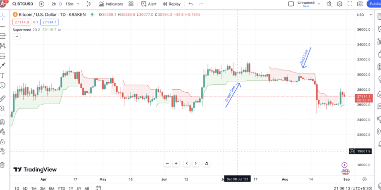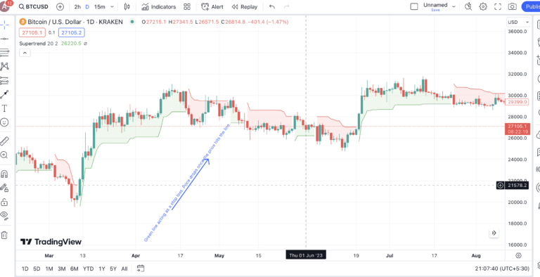 Le marché crypto est connu pour sa volatilité, d’où l’importance de l’ATR,. Toutefois, si vous envisagez d’utiliser SuperTrend comme indicateur pour identifier les signaux d’achat et de vente, vous pouvez vous fier aux changements de couleur. Bien que nous ayons déjà abordé les bases, voici comment vous pouvez utiliser l’indicateur SuperTrend pour trader des crypto.