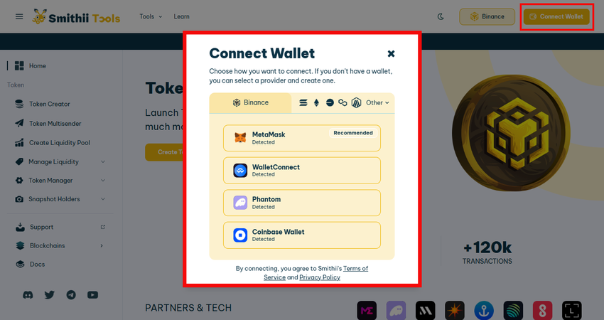 4. Connectez-vous à Smithii Tools : Appuyez sur le bouton Connect Wallet pour vous connecter à votre portefeuille. Dans le menu, passez à la BNB Smart Chain. Ensuite, sélectionnez MetaMask ou un portefeuille web3 compatible afin de vous connecter à la plateforme.