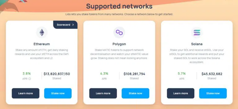 Lancé en 2020, Lido est incontestablement le leader du marché du liquid staking. Au début, la plateforme ne proposait que du staking Ethereum. Mais au fil du temps, elle a étendu ses services à d’autres blockchains, comme Polygon, Solana et Kusama.