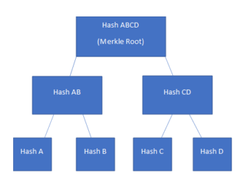 - Enfin, les paires de données sont réunies dans ce que l’on appelle une racine de Merkle Tree H(A,B,C,D)