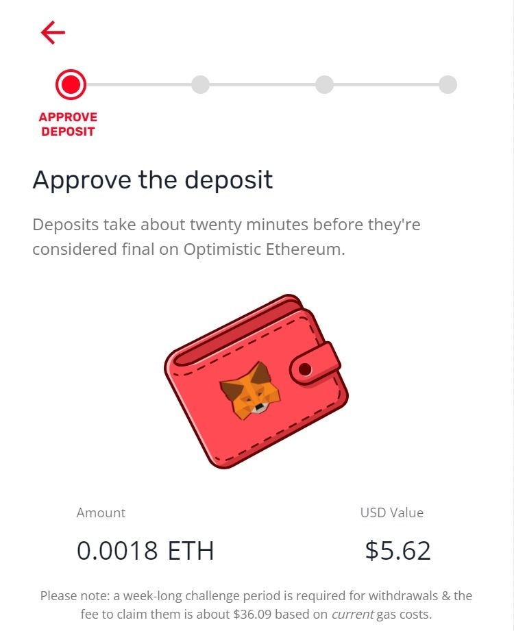 Vous pouvez ensuite effectuer un dépôt. Une fois celui-ci reçu, le réseau commencera à déposer vos actifs crypto sur Optimistic Ethereum.