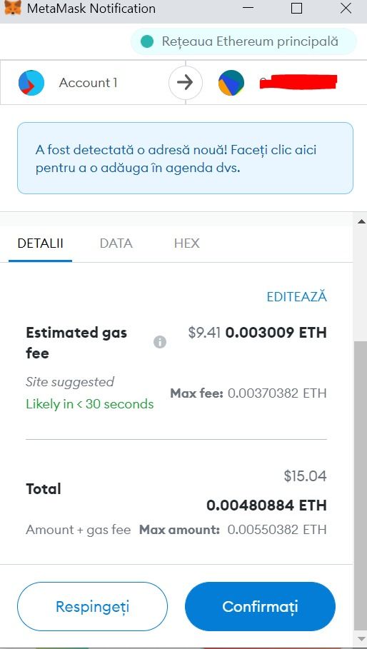 Lors de l’opération, vous aurez besoin de confirmer la transaction, y compris les frais de gaz.