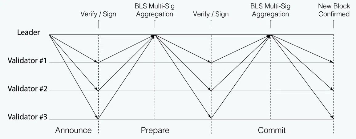 Contrairement aux autres protocoles de sharding qui utilisent la preuve de travail (PoW) pour sélectionner les validateurs, Harmony (ONE) utilise un mécanisme basé sur la preuve d’enjeu (PoS). Il atteint des consensus en utilisant un algorithme BFT (Byzantine Fault Tolerance ou tolérance aux pannes byzantines) évolutif, qui est 100 fois plus rapide que le PBFT (Practical Byzantine Fault Tolerance).