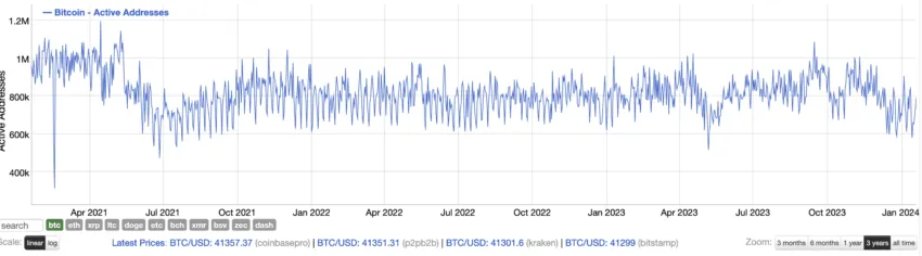 Si l’on examine le graphique des adresses actives du réseau Bitcoin, une tendance intéressante se dessine. En effet, à partir de 2024, le nombre d’adresses actives semble diminuer. Cela pourrait signifier un schéma de retenue.