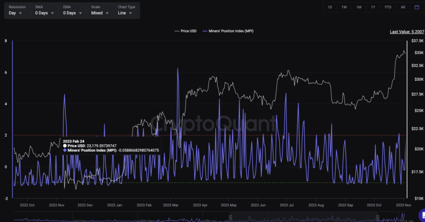 Il est important de noter que le MPI (Miner’s Position Index) est un indicateur plus fiable, car il prend le total des sorties des mineurs et établit un rapport avec la moyenne des 365 jours, fournissant ainsi des résultats plus précis.