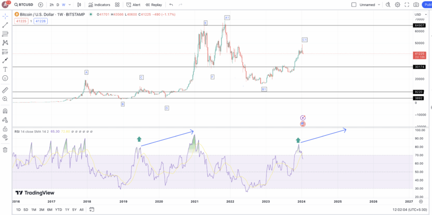 Remarquez que le RSI a commencé à atteindre un sommet à C, le premier sommet inférieur sur le graphique. Après cela, l’indice a atteint un sommet, tout comme le cours après le halving de 2020. À C1, le RSI se trouve maintenant à un niveau similaire, et avec l’événement de halving prévu pour moins de trois mois, une flambée du cours du BTC semble imminente.