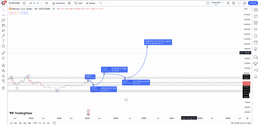 Nous avions le dernier sommet, ou C1. En utilisant les points de données précédents, nous avons alors supposé que le pourcentage de baisse le plus bas pourrait être de 72,51 % à partir de ce niveau, tout en supposant que le cours du BTC se tiendra près de la marque de 31 810 $. Il s’agissait là de notre prévision pour le prix minimum de Bitcoin en 2024.