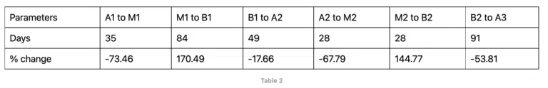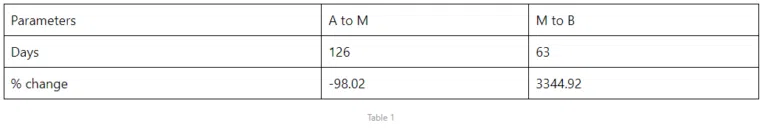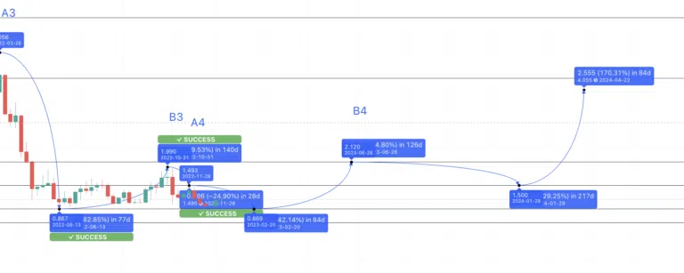 Notre objectif de prix a changé. Nous devons donc trouver le point A4, en utilisant la distance moyenne entre les points B et A. Sur la base du tableau ci-dessus, la distance et la variation de prix entre B à A sont de 70 jours et 35,74 %. Ainsi, A4 devrait être inférieur à B3, car le marché crypto est toujours en phase baissière et nous n’avons aucun catalyseur de hausse.