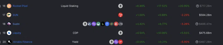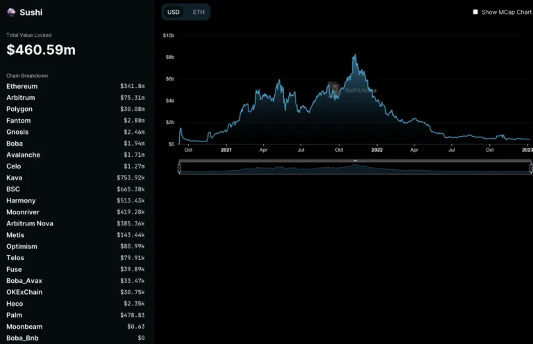 Actuellement, SushiSwap est classé 18ème en termes de valeur totale verrouillée (TVL). Le réseau a été initialement conçu comme un hard fork d’Uniswap, mais avec des fonctionnalités plus avancées. Son token natif, SUSHI, est exposé à plus de 20 blockchains et a une TVL de 450,59 millions de dollars.