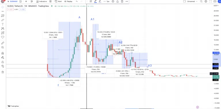 Notez que le point B4, qui représente le prix maximum de SUSHI en 2023, est supérieur aux points B3 et A4. Ainsi, on s’attend à ce que ce point marque le commencement d’une tendance haussière pour SushiSwap.