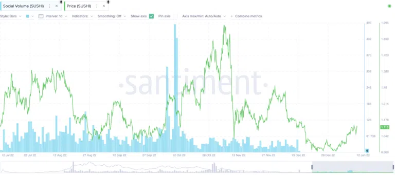 Comme on peut le voir dans le graphique ci-dessous, le volume social de la crypto SUSHI est également corrélée à son cours. En effet, le cours de SUSHI augmente toujours en tandem avec son volume social. Par conséquent, il serait judicieux de garder un œil sur le volume social du token.