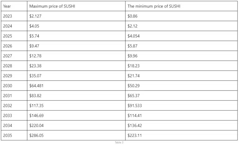Si vous prévoyez de garder la crypto SUSHI pour le long terme, ce tableau vous donnera une idée sur ses perspectives d’évolution. Notez que la croissance du token SUSHI dépendra également de sa capitlaisation boursière, du développemet du DEX SushiSwap et d’autres facteurs.