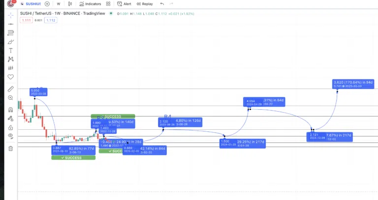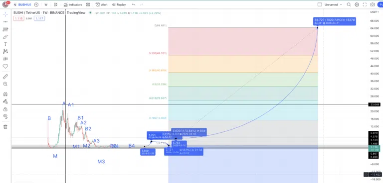 Maintenant que nous avons le sommet de 2025 et le creux de 2024, nous pouvons utiliser les niveaux de retracement Fib afin de prédire le cours de SUSHI pour 2030.