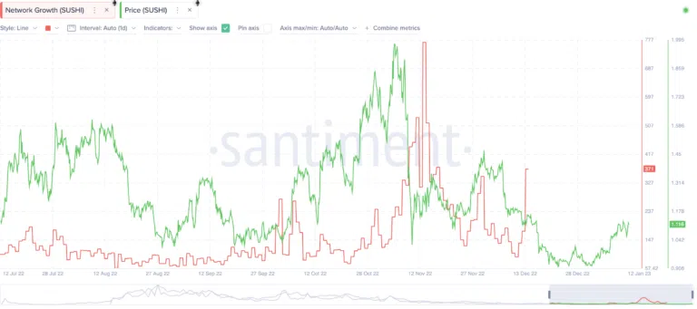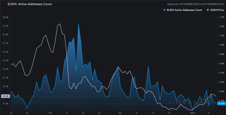 Mis à part le mois de novembre 2022, l’augmentation du nombre d’adresses actives a toujours été suivie d’une hausse du cours SUSHI. Cette corrélation peut être considérée comme un signe positif pour l’évolution du token à long terme.