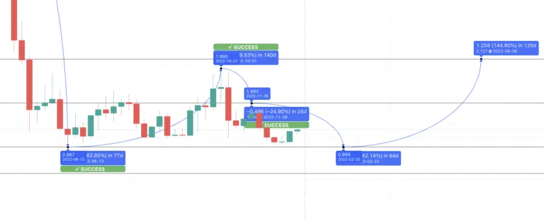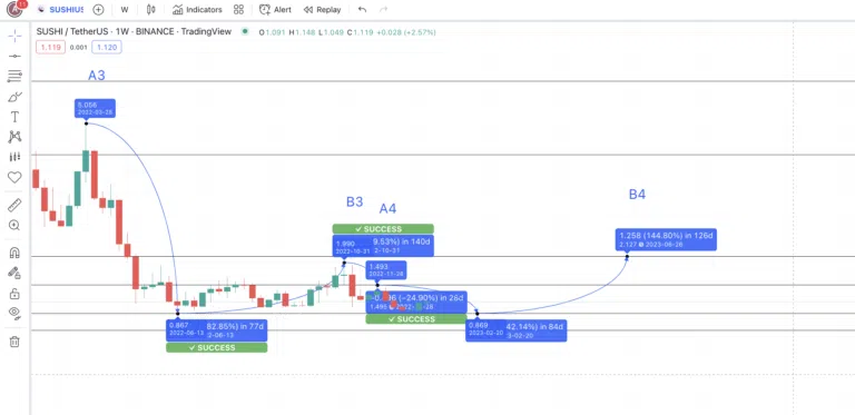 Maintenant que nous avons identifié le point M3, nous pouvons tracer le chemin vers B3 en utilisant les données des tableaux ci-dessus. La hausse minimale à partir des creux est de 144,77 % (d’après le 2ème tableau). Compte tenu de l’état actuel du marché crypto, nous pouvons nous attendre à ce que le cours de SUSHI atteigne un sommet d’environ 2 $ en 2023.