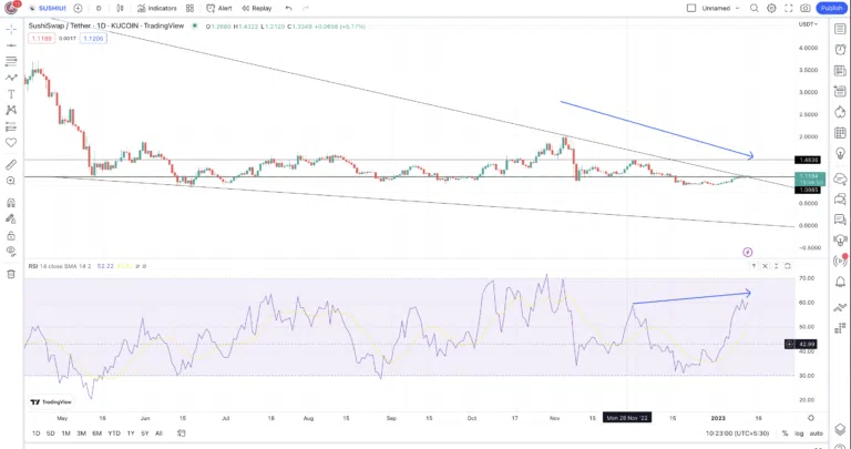 Pour cela, la crypto SUSHI doit maintenir son volume actuel et franchir la barre des 1,49 $. Le RSI, ou l’indicateur de momentum, évolue au-dessus de sa moyenne mobile sur 14 jours (jaune). De même, on observe une nette divergence haussière, car le RSI atteint des highers highs (sommets supérieurs), tandis que le cours SUSHI enchaîne les lower highs (sommets inférieurs).