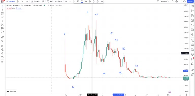Nous pouvons tracer le prochain creux (M3) à partir du point A3 en utilisant la moyenne A à M. Il s’avère que le prochain creux sera à 0,867 $, ce qui représente une baisse de 82,85 % (presque égale à notre taux de baisse moyen). Cela montre que notre prévision du cours SushiSwap évolue dans la bonne direction.