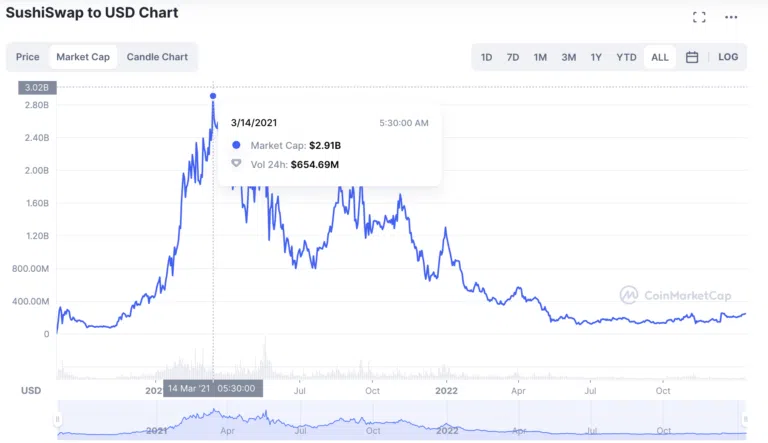 - La capitalisation boursière de SushiSwap a atteint un record de 2,91 milliards de dollars le 14 mars 2021.