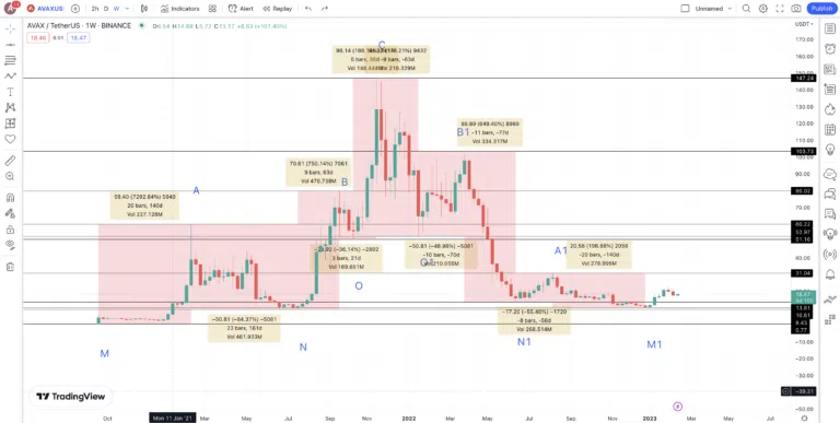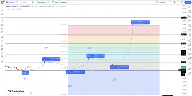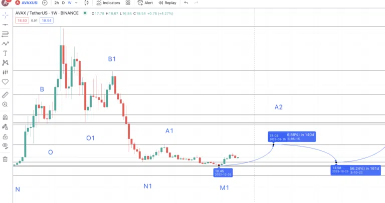 Maintenant que nous connaissons le dernier creux (M1), nous pouvons utiliser la variation moyenne entre les creux et les sommets pour prédire le prochain pic d’AVAX. Étant donné que le token connaît une croissance continue de son volume de transactions, nous nous attendons à ce qu’il atteigne un sommet de 31,04 $ en 2023. Nous allons considérer ce sommet comme le point A2.