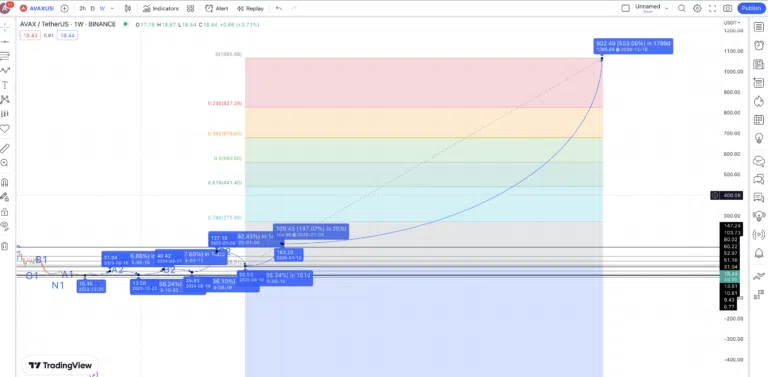 Maintenant que nous connaissons le creux de 2025 et le sommet de 2026, nous pouvons utiliser les lignes de retracement Fib pour suivre le cours AVAX jusqu’en 2030. Ainsi, si tout se passe bien, le token devrait atteindre un sommet de 1065,69 $ en 2030.
