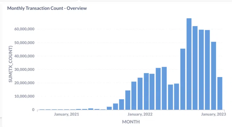 Malgré l’accalmie générale du marché crypto, Avalanche a su tirer son épingle du jeu. Au cours des 30 derniers jours, l’activité on-chain du réseau a grimpé de près de 10%. De même, son volume de transactions annuel a augmenté de 1 500 % en 2022. Et mieux encore, l’écosystème NFT du réseau s’est considérablement développé avec l’intégration d’OpenSea.