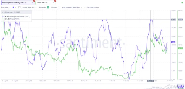 L’activité de développement du réseau Avalanche pourrait également avoir un impact sur le cours AVAX. Comme le montre le graphique ci-dessous, chaque pic d’activité est suivi d’une flambée du cours Avalanche. Ainsi, le pic d’activité du 28 janvier (qui a été motivé par le lancement de plusieurs fonctionnalités Web3) constitue un signe de bon augure pour AVAX.