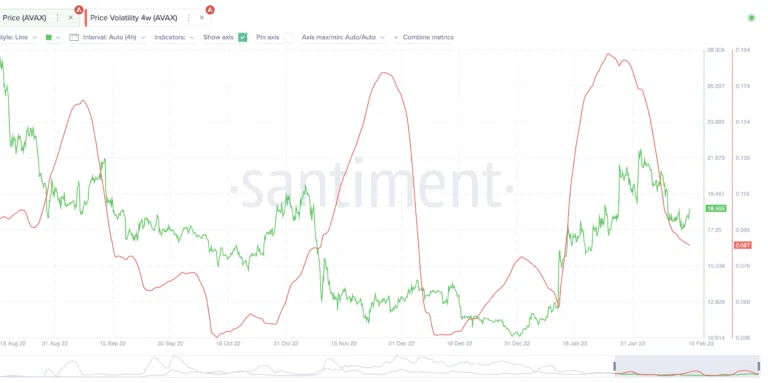Avant d’investir dans une crypto, nous devons tout d’abord évaluer sa volatilité. Le graphique ci-dessous montre que la volatilité de la crypto Avalanche suit une trajectoire baissière. Comme vous l’aurez remarqué, chaque baisse de la volatilité est suivie d’une hausse du prix, ce qui signifie que AVAX pourrait bientôt renouer avec le vert.