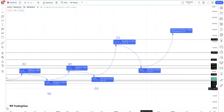 À partir du creux de 25,83 $, nous nous attendons à ce que le cours AVAX grimpe de 392,55 %, pour atteindre son prochain sommet (C2). Là aussi, nous avons choisi le taux de hausse moyen car nous nous attendons à ce que les conditions du marché crypto s’améliorent au cours des deux prochaines années.
