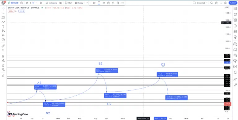 Maintenant que nous avons le creux de 2025 et le sommet de 2026, nous pouvons extrapoler les données pour prédire le cours Bitcoin Cash jusqu’en 2030.