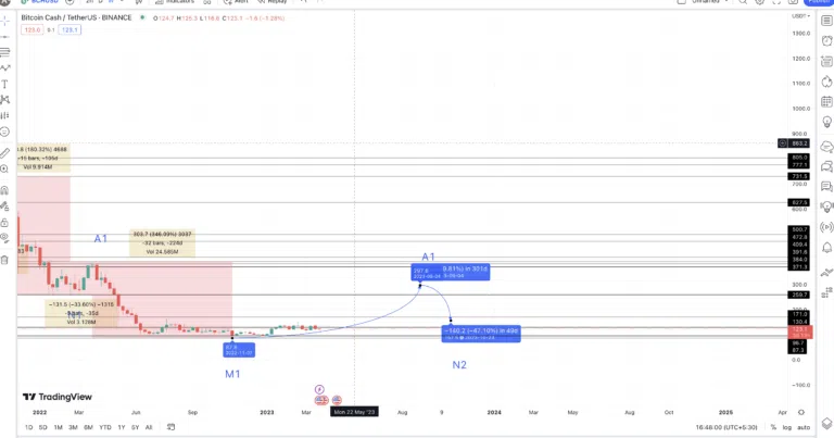 À partir du point M1, qui représente le dernier creux du graphique hebdomadaire, la crypto BCH devrait grimper de 238,85% pour atteindre son prochain sommet (A2). Cependant, vu les conditions actuelles du marché crypto, ce mouvement pourrait nécessiter 301 jours (soit la durée maximale de passage d’un creux à un sommet).