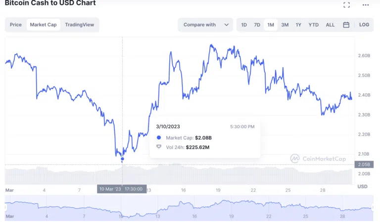 On ne peut pas prédire la trajectoire future du cours BCH sans analyser sa capitalisation boursière. Comme nous pouvons le voir sur le graphique ci-dessous, la market cap de Bitcoin Cash est tombée à 2,06 milliards de dollars le 10 mars 2023, avant de remonter à 2,42 milliards de dollars.