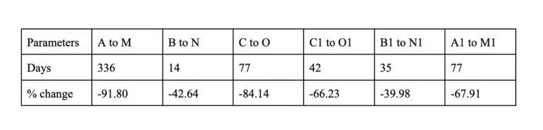 En atteignant le point A1, FIL aura complété son schéma actuel. Nous devons donc créer un autre tableau pour calculer la variation et la distance entre les sommets inférieurs et les creux (de A à D et de A1 à D). Cela nous aidera à localiser le point suivant et à prédire le prochain creux du token.