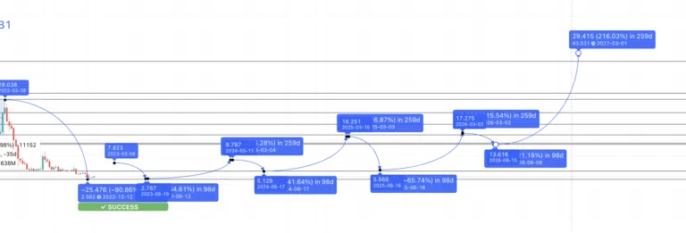 En utilisant les points de retracement Fib à partir du pic de 2027 et du creux de 2026, nous pouvons prédire le cours Filecoin pour 2030. Ainsi, si le token poursuit sa trajectoire haussière, il devrait atteindre un sommet de 187,325 $ en 2030.